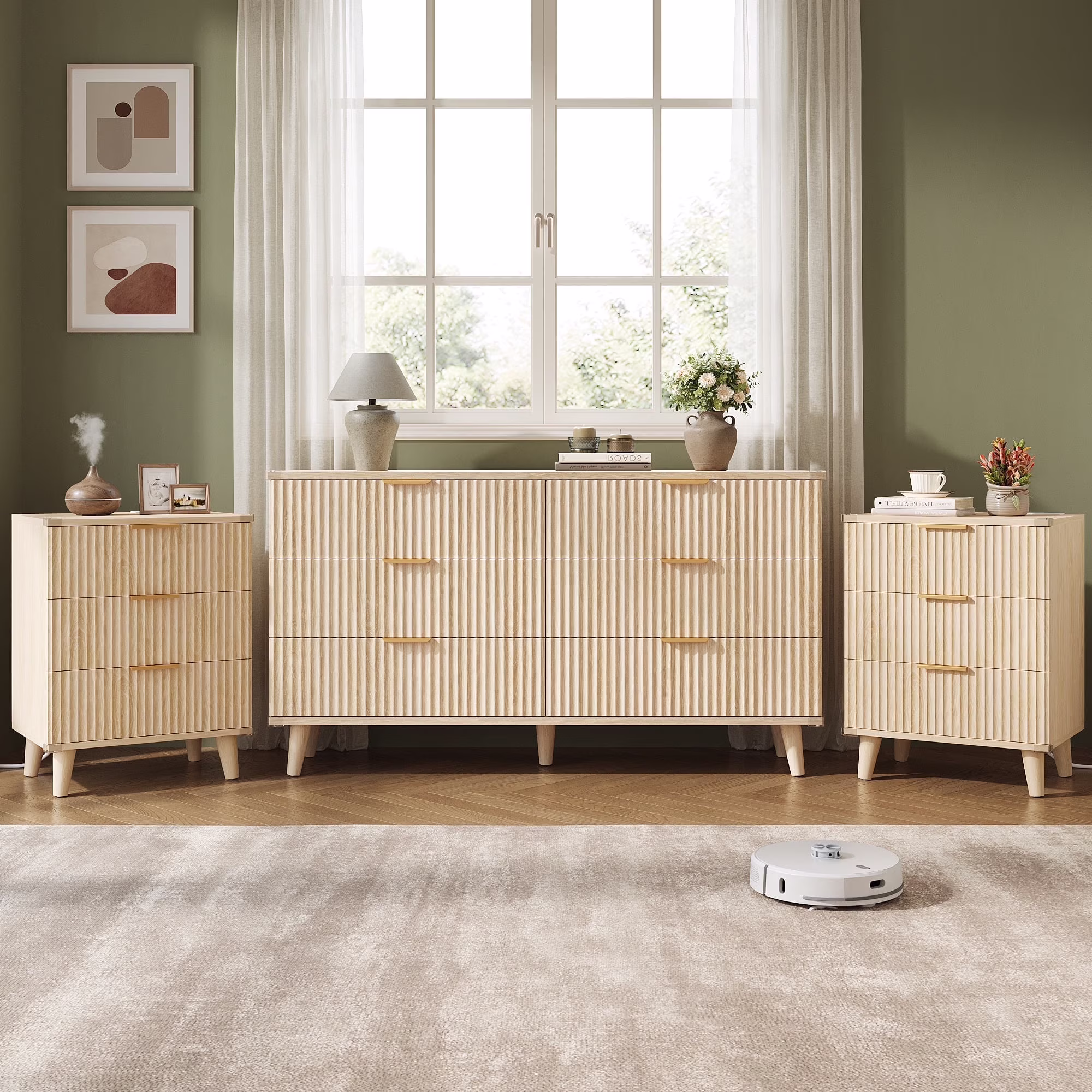 GIKPAL Bedroom Dresser and Nightstand 3‑Piece Set — Includes Boho Double 6‑Drawer Storage Dresser is a stylish and functional furniture ensemble designed to bring both storage and aesthetic charm to your bedroom. This set typically includes a double 6‑drawer dresser and two matching nightstands, giving you coordinated storage solutions that enhance everyday organization while complementing boho‑inspired or contemporary décor.The double 6‑drawer storage dresser offers ample space for clothing, linens, and accessories, helping keep your bedroom tidy and clutter‑free. With six spacious drawers, you’ll have room to sort and store everything from folded garments to seasonal wear. The dresser’s top surface also serves as a practical display area for décor, mirrors, lamps, or personal items.Each nightstand adds convenience and balance to your bedside area, typically featuring drawers and an open shelf for easy access to essentials like books, glasses, chargers, or a bedside lamp. Having matching nightstands on both sides of the bed creates a cohesive look and enhances functionality for couples or shared spaces.The set’s boho design elements — such as warm wood tones, textured finishes, or subtle decorative accents — add laid‑back charm and visual interest to your bedroom. The natural hues and craftsmanship help the set blend with various color palettes and interior styles, from bohemian and eclectic to modern farmhouse and transitional.Built with everyday use in mind, the dresser and nightstands are often constructed with durable materials and smooth‑glide drawers, ensuring longevity and easy access to storage. Assembly is usually straightforward with included instructions and hardware.Overall, the GIKPAL 3‑Piece Bedroom Dresser and Nightstand Set offers ample storage, coordinated style, and practical design — making it an excellent choice for anyone looking to organize their bedroom with attractive, cohesive furniture that supports both function and décor. Whether you’re upgrading your master suite or furnishing a guest room, this set delivers versatile storage and boho‑inspired appeal.